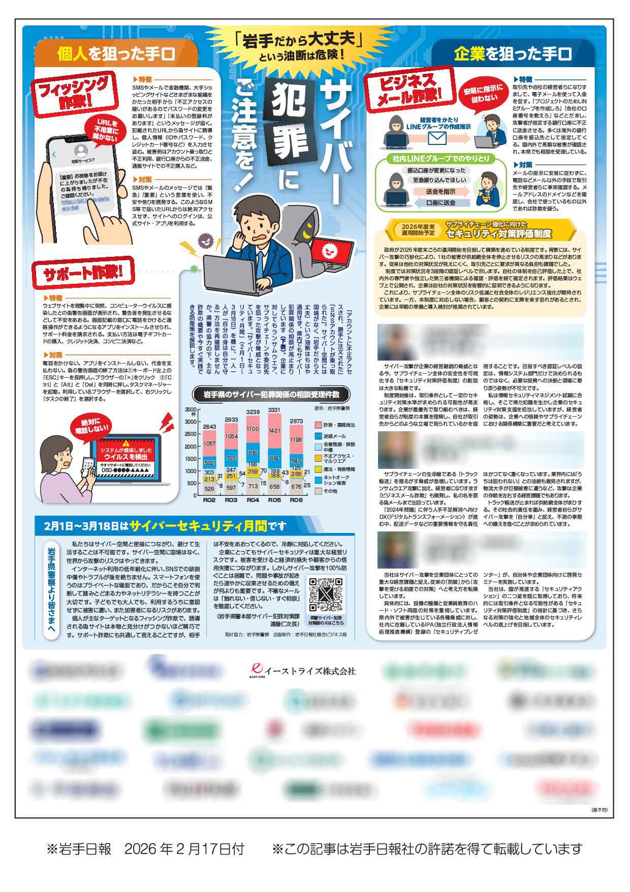 令和8年2月17日(火)岩手日報朝刊に掲載されたサイバーセキュリティ啓発広告に協賛し、当社ロゴが掲載されました。 近年、ITシステムやネットワークは社会インフラとして不可欠なものとなっておりますが、一方で標的型攻撃やラン ...