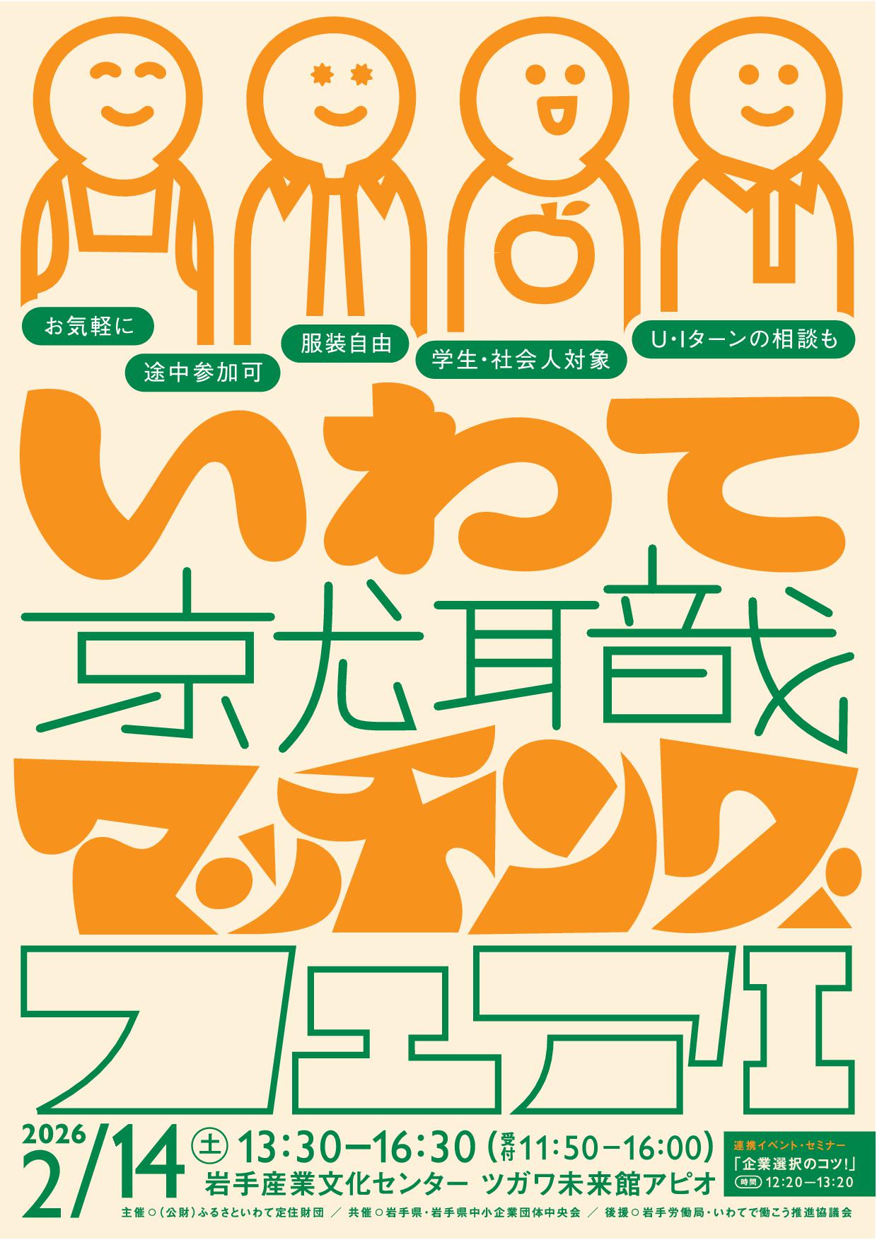 令和8年2月14日(土)、岩手産業文化センターツガワ未来館アピオで開催される『いわて就職マッチングフェアⅠ』へ出展いたします。