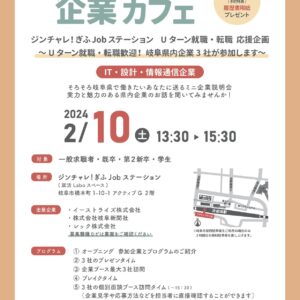 続きを読む令和6年2月10日(土)に、ジンチャレ!ぎふJobステーションで開催される『企業と出会えるシリーズ企業カフェ6th』に出展いたします。岐阜県での就職(UIJターンを含む)をご検討の方、イーストライズへ入社をお考えの方は是 ...